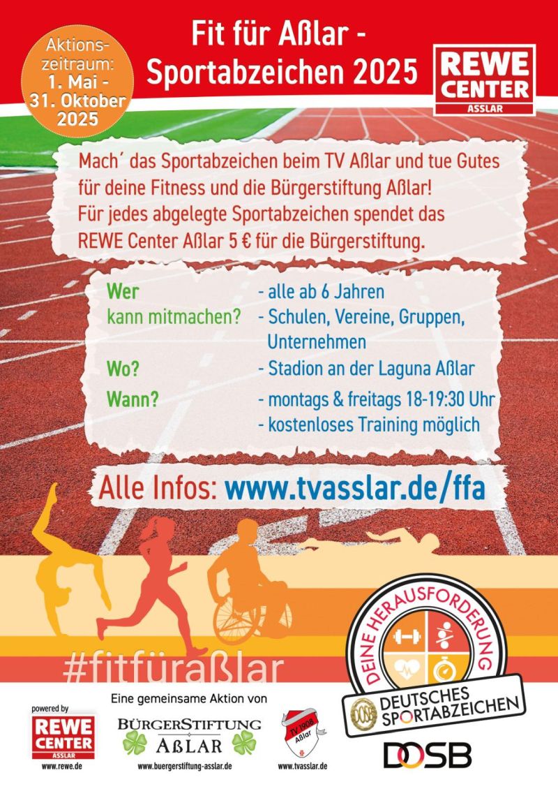Eingeladen sind alle Aßlarer ab 6 Jahren sowie Schulen, Vereine, Gruppen und Unternehmen aus Aßlar. Für jedes abgelegte Sportabzeichen im Zeitraum 1. Mai - 31. Oktober 2025 spendet das REWE Center Aßlar 5 € an die Bürgerstiftung Aßlar.